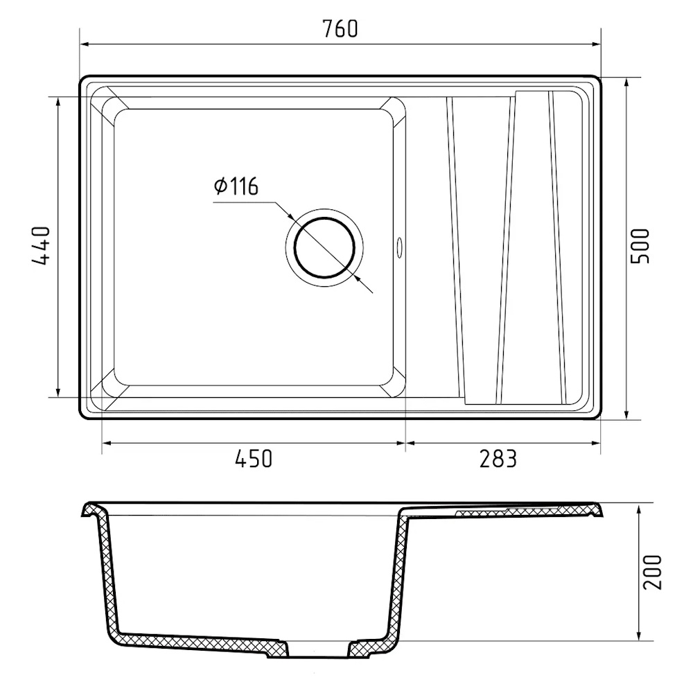 Мойка для кухни GranFest GF-LV-760L - благодаря продуманной эргономике и оригинальному дизайнерскому решению крыла ее можно установить в шкаф шириной 600 мм. Дизайнерскую модель отличают большая практичная чаша размером 450*440 мм, и глубиной 200 мм, которая с легкостью позволит разместить внутри крупногабаритную посуду и промывать ее без лишних усилий. Игра плоскостей на функциональном крыле помогает удобно расположить уже вымытую посуду, чтобы с нее стекала вода. Броская, оригинальная коллекция LEVEL выполнена в очень запоминающейся стилистике, которую во многом поддерживает необычный 3d рельеф на крыле. Трёхмерный рисунок похож на плавно перетекающие друг в друга ступени.