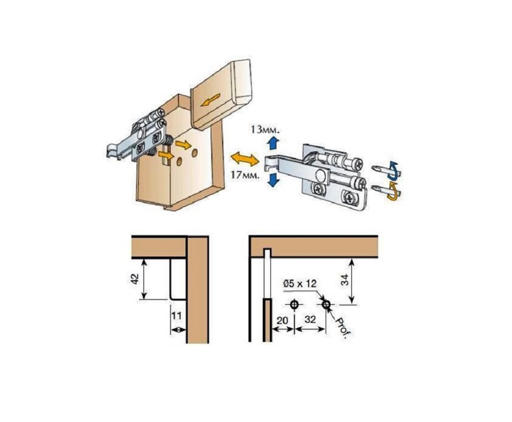 Навес регулируемый усиленный с разрешенным весом до 100кг. Предназаначен для подвески шкафов и кухонных модулей. Для крепления рекомендуются евровинты 6,3*13. Рекомендуемая толщина крепежной планки - 1,2 мм - 1,5 мм. Диапазоны регулировок: по высоте – 13 мм, по глубине – 17 мм, по ширине – 8 мм.